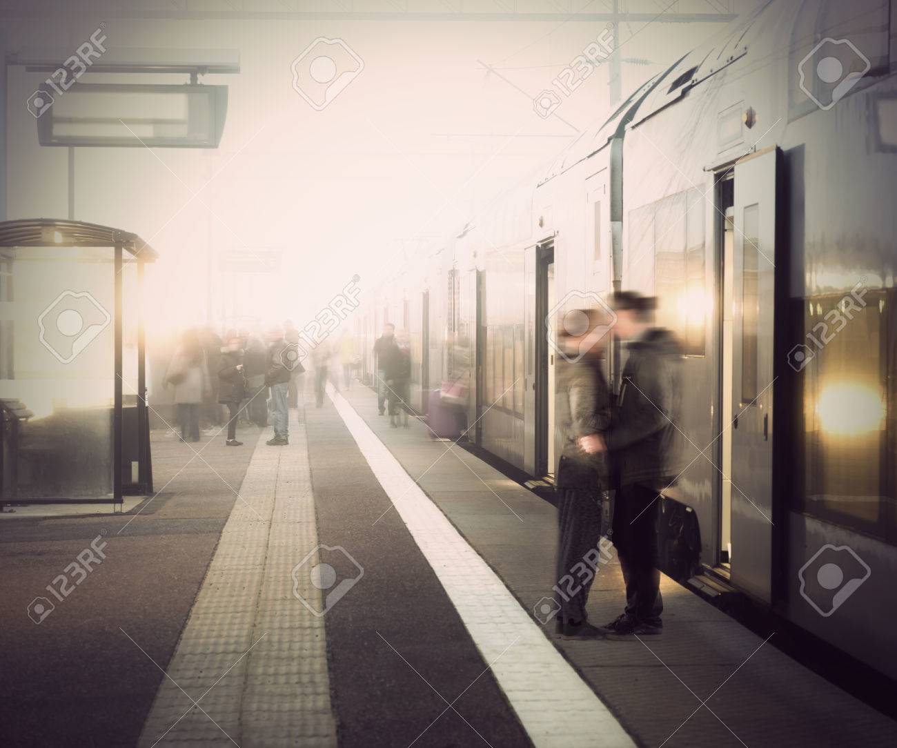 霧の日に駅で電車を出発前に若いカップルを別れの写真素材・画像素材 Image 47400371。