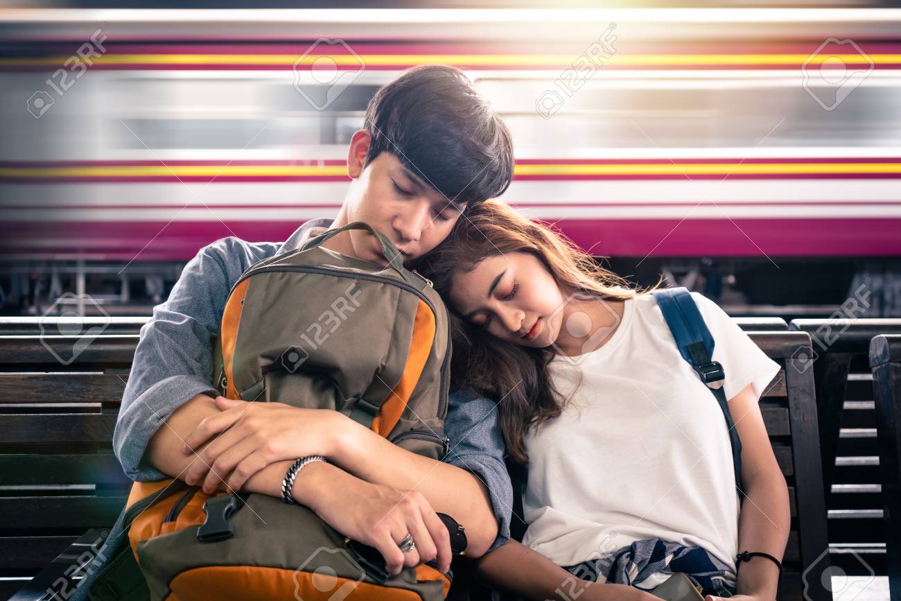 鉄道駅で電車を待っている間に眠っている若いカップルの旅行者の写真素材・画像素材 Image 110899695。