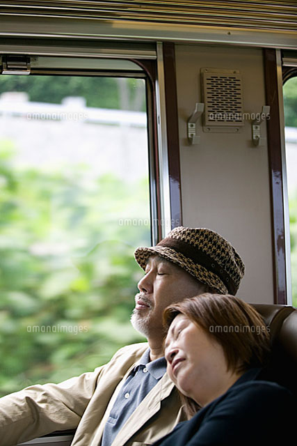 電車の中でうたた寝をするシニアカップル 11002024985 の写真・イラスト素材アマナイメージズ。