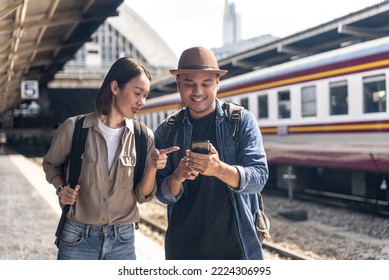 素敵な若いアジア人観光客のカップルが電車に乗る前にプラットホームでおしゃべりを楽しんでいますPremium写真。