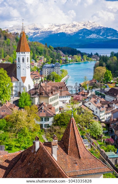 スイスのトン城やアルペン山脈の古い町並みのアエリア風景。スイスアルプスのスイス村。雪山を持つスイスの国の風景。写真素材1043335828Shutterstock。