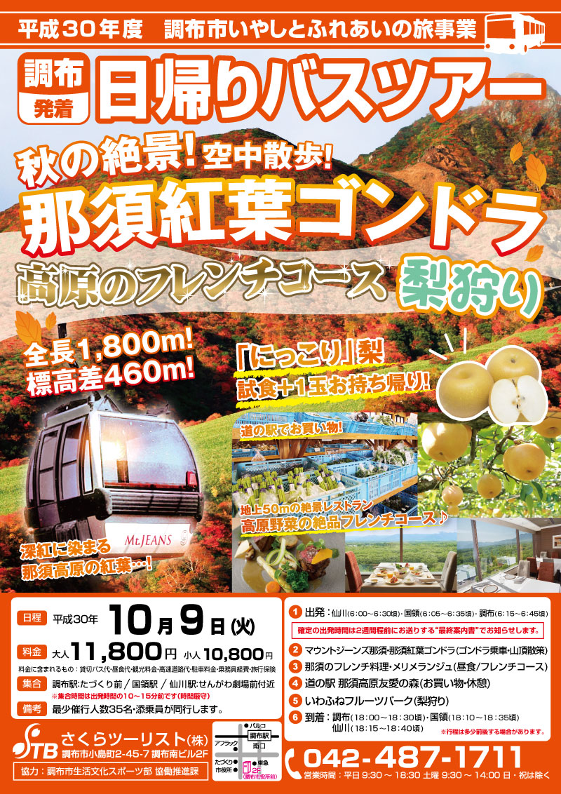 日帰りバスツアーのお知らせ<10 9那須>那須紅葉ゴンドラ・高原のフレンチコース&梨狩り – 東京調布市の旅行会社さくらツーリスト株式会社。