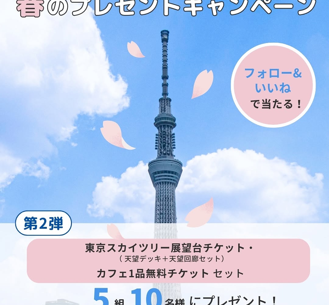 Instagram懸賞 東京スカイツリー展望台チケット 天望デッキ+天望回廊セット &SKYTREECAFEで使える1品無料券 最大700円まで。