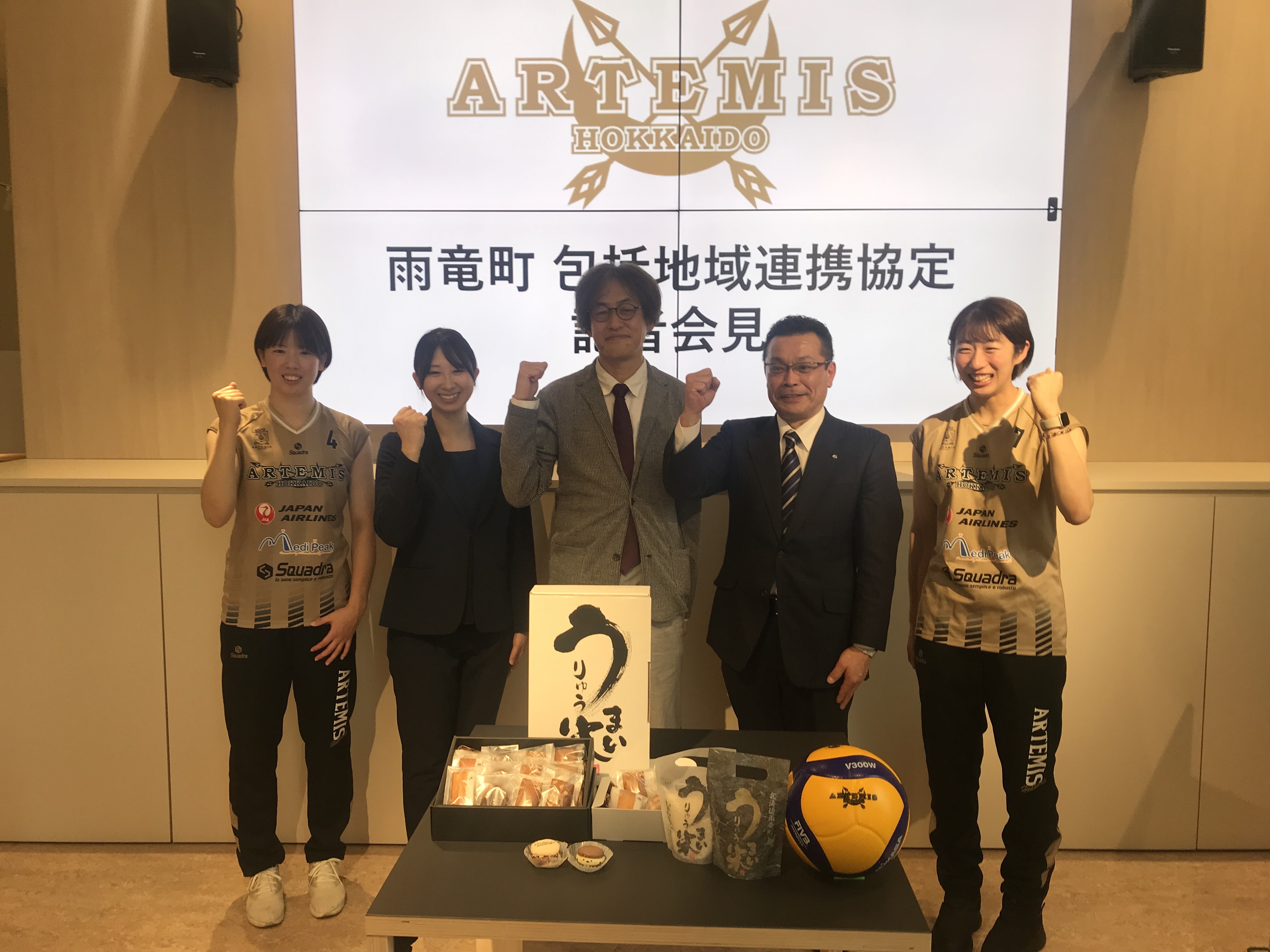 サンフレッチェ広島マスコットのサンチェとフレッチェと記念撮影。 by 原博実 Jリーグ副理事長: エディオンスタジアム広島。