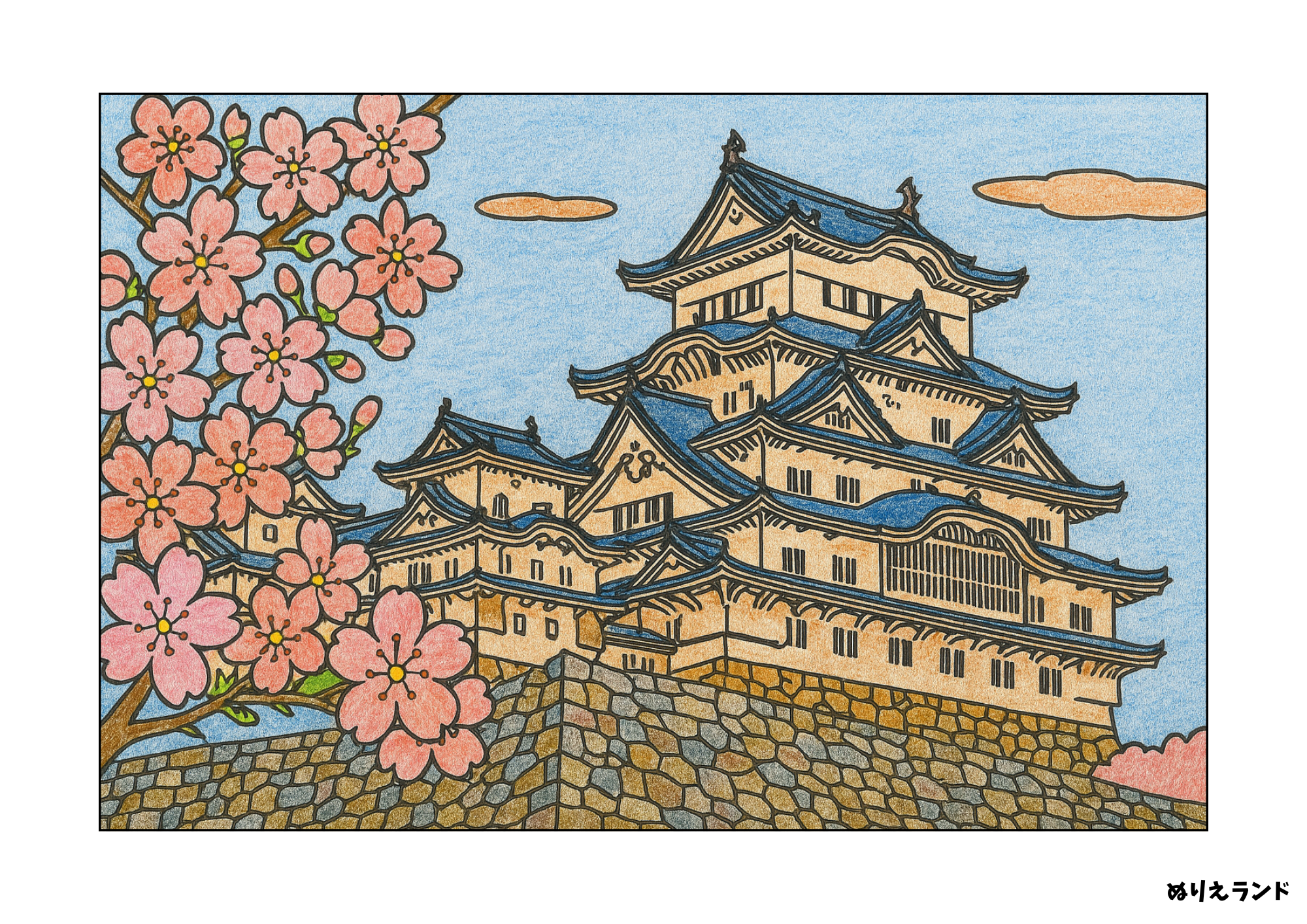 春の姫路城 塗り絵見本あり・高齢者も楽しめる無料素材。