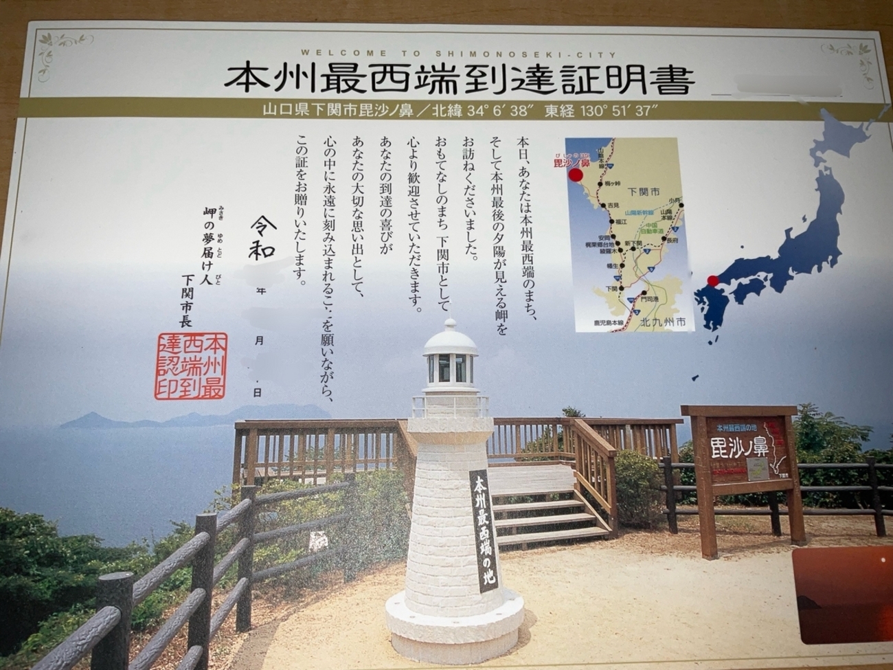 下関の記念証 本州最西端の地「毘沙ノ鼻」到達証明書!下関観光コンベンション協会。