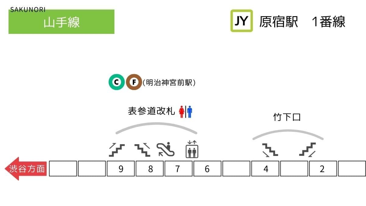 原宿駅1番線から竹下口改札への行き方。