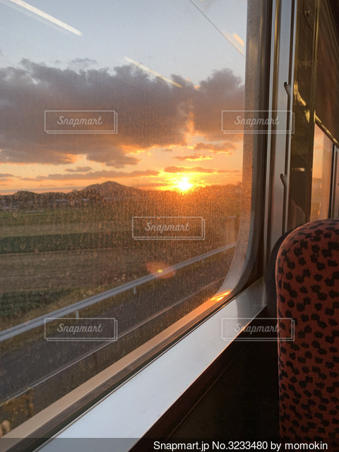 電車の車窓から見える夕焼けの写真・画像素材-Snapmart スナップマート。
