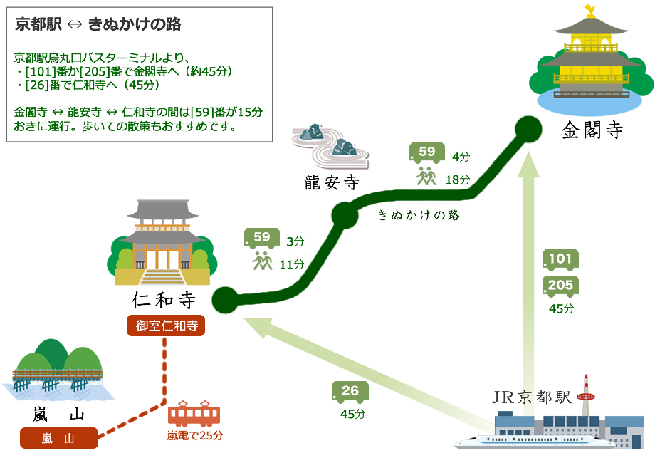 京都駅から金閣寺への行き方金閣寺・龍安寺・仁和寺 - 3つの世界遺産を巡る観光道路「京都きぬかけの路」。