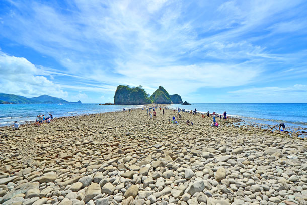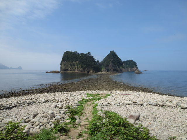 西伊豆の瀬浜海岸 干潮時に三四郎島まで歩いて渡ることができる。潮干狩りにも最適で、この現象は「トンボロ現象」と呼ばれ、世界でも稀な現象。瀬浜海岸干潮 三四郎島 海の道。