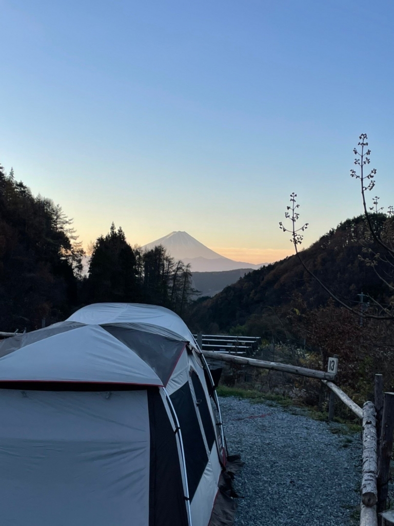 きょうは山梨県の「7inch CAMP 7インチキャンプ場」に来ています。雲がなければ山のあいだから富士山が見える、とても良い感じのキャンプ場。