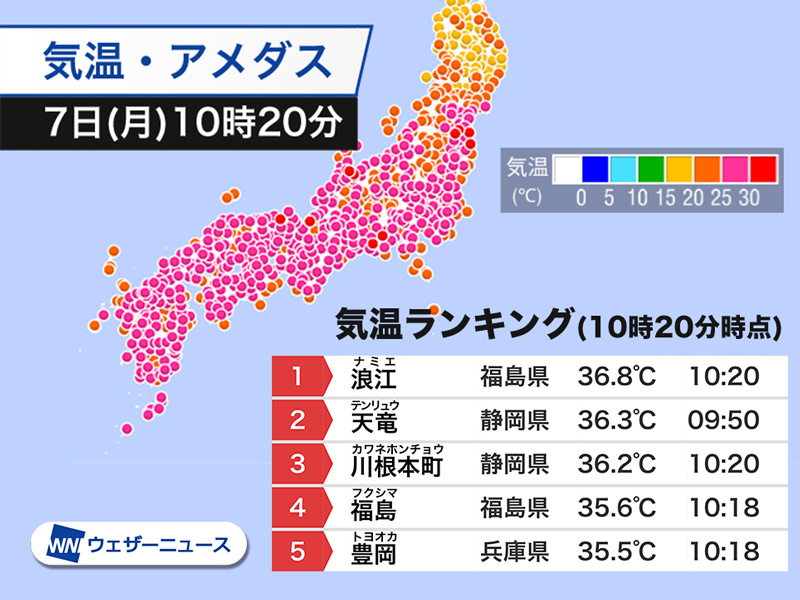ウェザーニュース on X: " 福島県で38℃超え福島県浪江町のアメダス浪江では38.3℃を観測。体温を超える危険な暑さです。正午までに、東北南部〜四国の計13地点で最高気温が37℃を超えています。 https:t.co VkKnCQpmok ▽最新のアメダス気温ランキングを見るhttps。