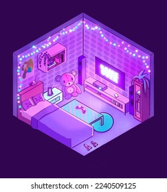 ピンクのアイソメトリックコンピュータゲームルーム女の子の寝室」のイラスト素材 2240509125Shutterstock。
