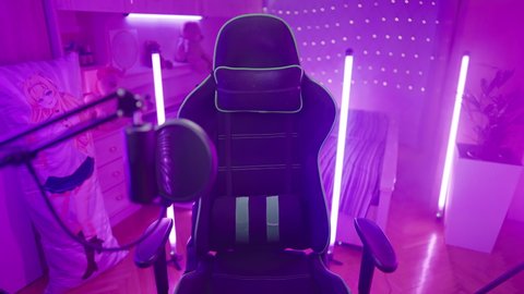 ネオン効果のゲームデスクとスクリーンのある部屋の内部 写真JPG 無料ダウンロード。