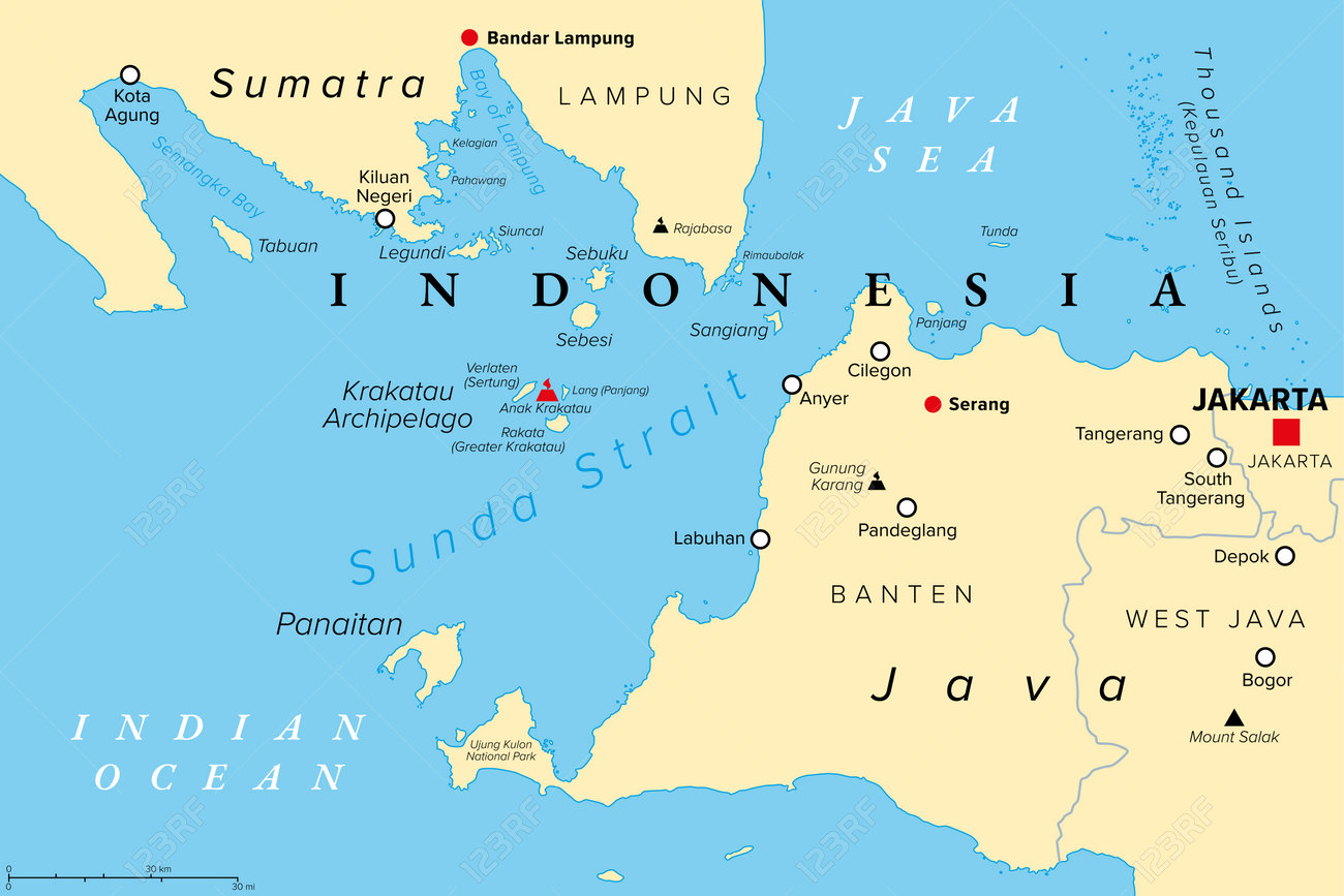 スンダ海峡、インドネシア、政治地図。インドネシアのジャワ島とスマトラ島の間の海峡で、ジャワ海とインド洋を結んでいます。クラカタウ諸島と。のイラスト素材・ベクターImage 228895896。