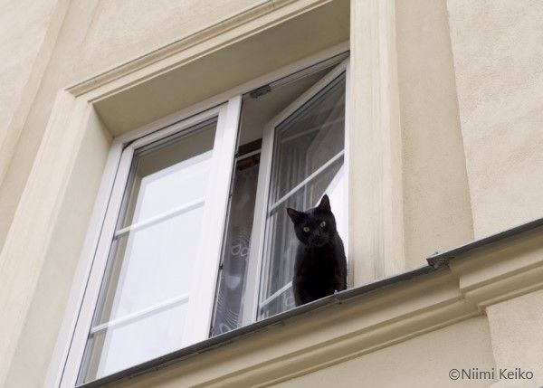 ピアノの鍵盤を思わせる白壁と黒猫、さすがショパンの生誕地ワルシャワ 「写真に写りたくないって」と飼い主さん、でもよく見ると右の窓に1 5JBpressジェイビープレス。
