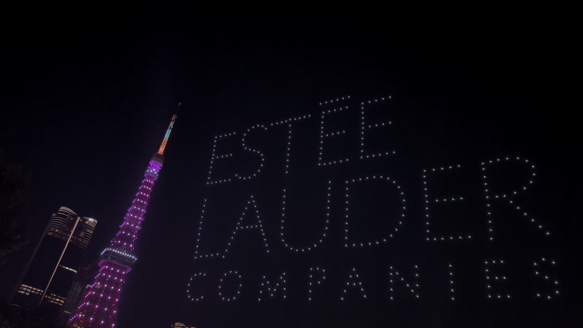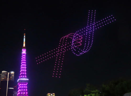 SkyDrive 10月1日にエスティ ローダーカンパニーズが主催する「乳がんキャンペーン」で、東京タワーを背景にピンクリボンをモチーフとしたドローンショーを実施。