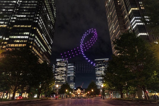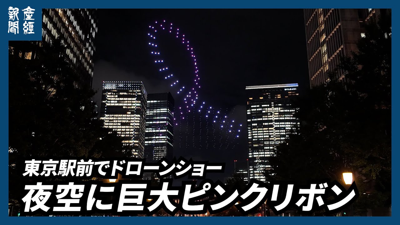 動画 乳がんのない世界を目指して 東京・丸の内でドローンショー、上空に大きなピンクリボン -。