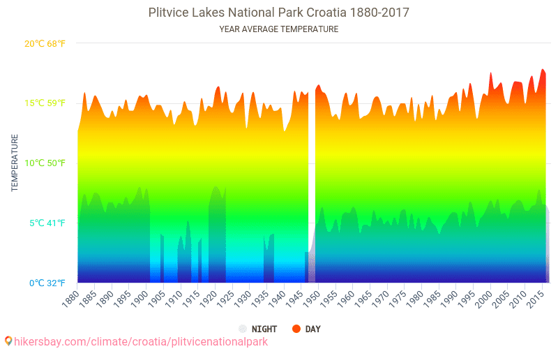 プリトヴィツェ湖群国立公園 クロアチア でのデータ テーブルおよびグラフ月間および年間気候条件。