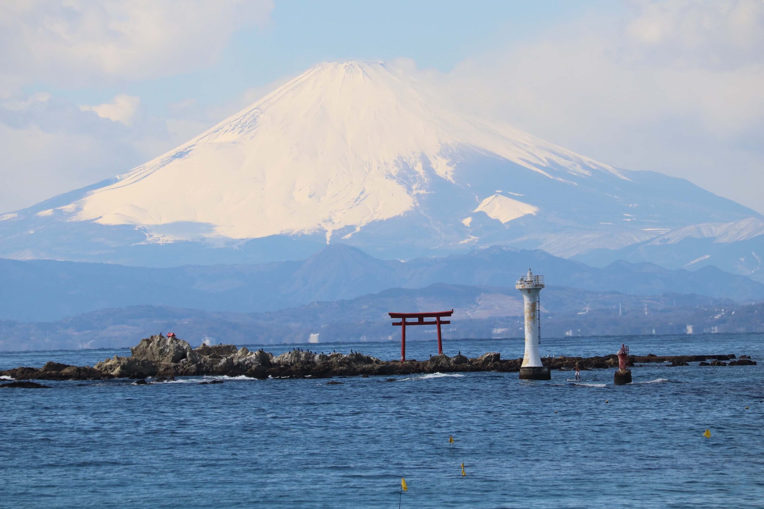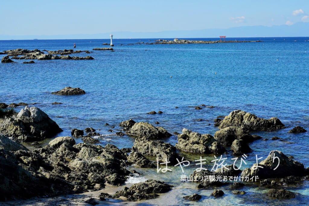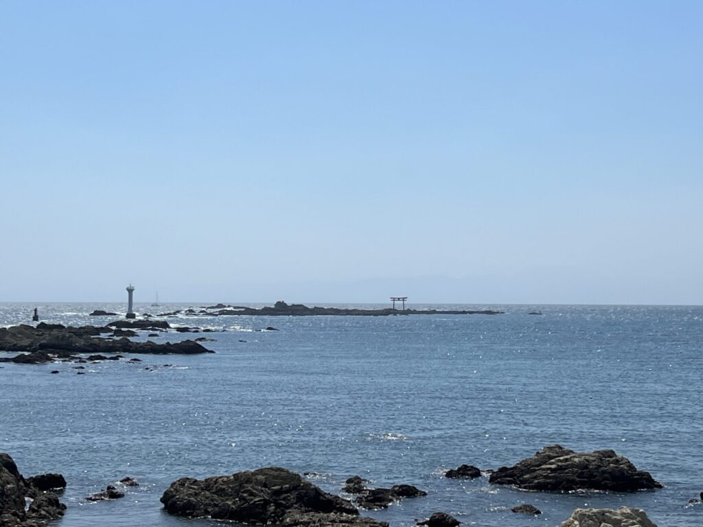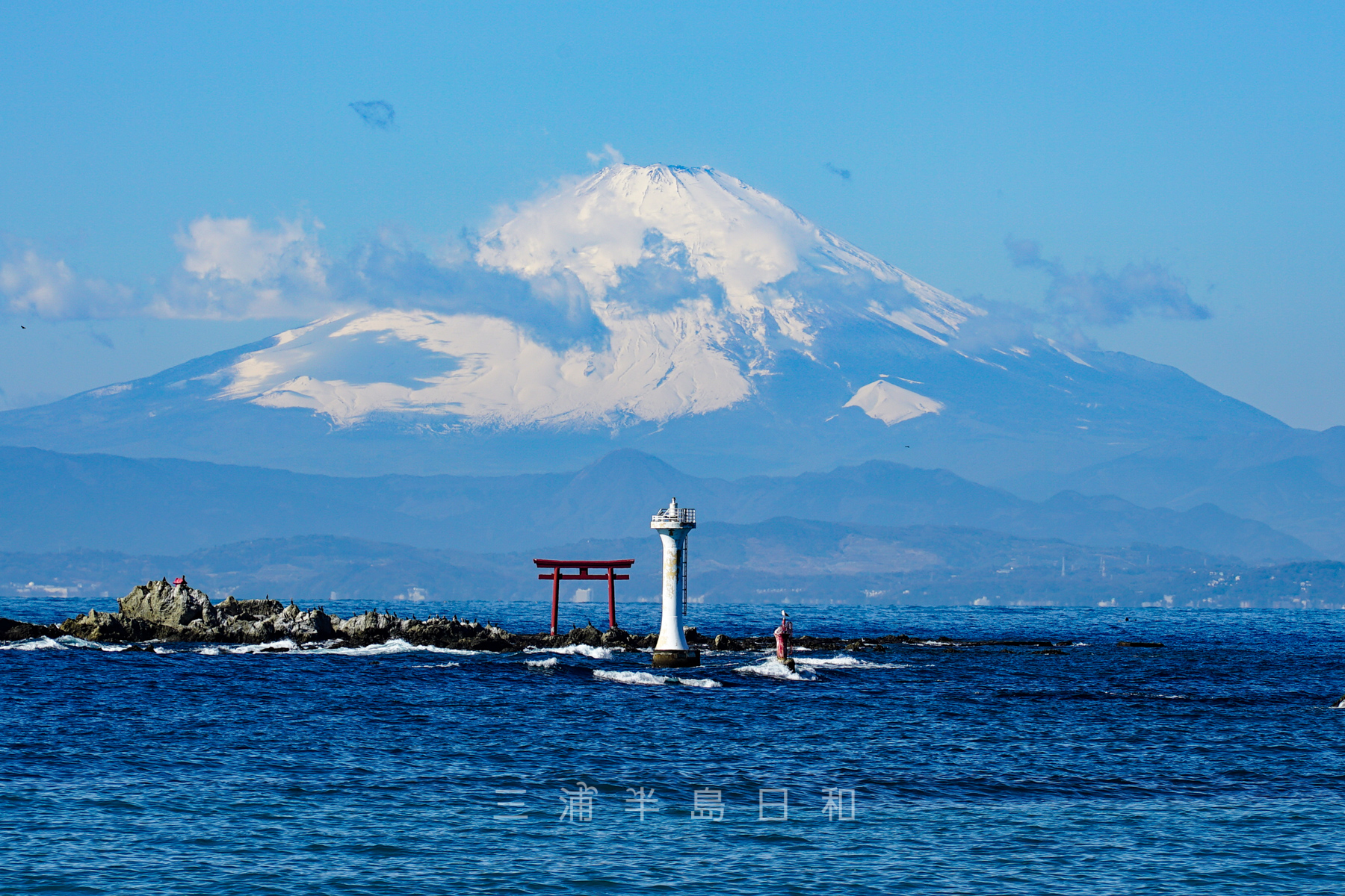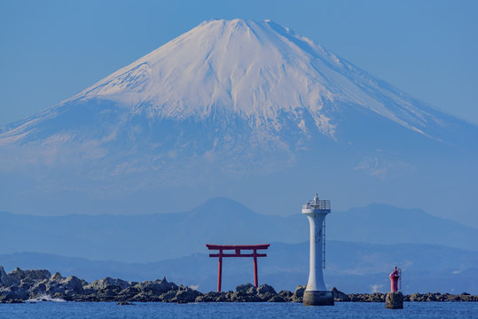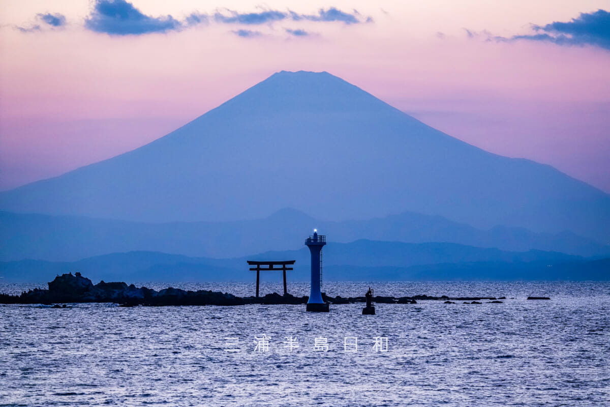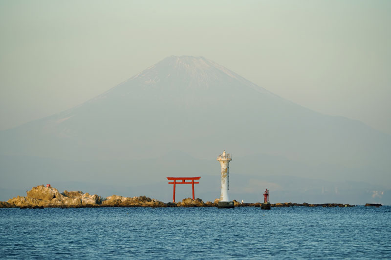名島 菜島 の鳥居と葉山灯台と江の島と富士山。
