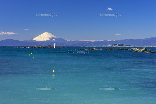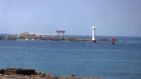 神奈川県三浦郡葉山町の森戸神社の海岸から観える名島 菜島 の鳥居のパノラマの写真素材81055884-。