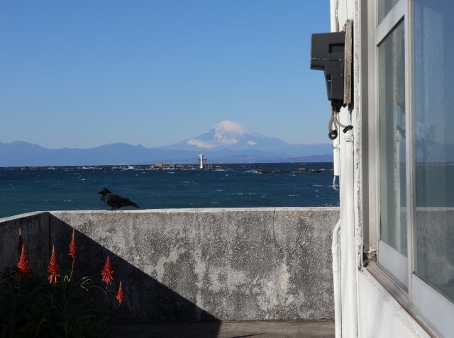真名瀬海岸葉山を代表する映えスポットは白いバス停から望む灯台や富士山が印象的。