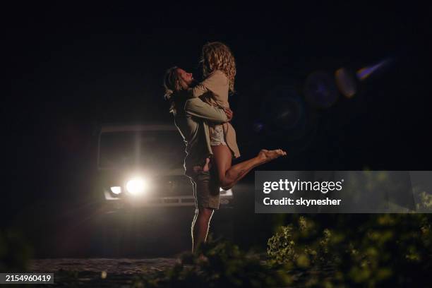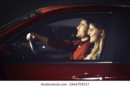 夜の車の中でハンサムなカップル笑顔と抱擁 - 運転するのストックフォトや画像を多数ご用意 - 運転する,。