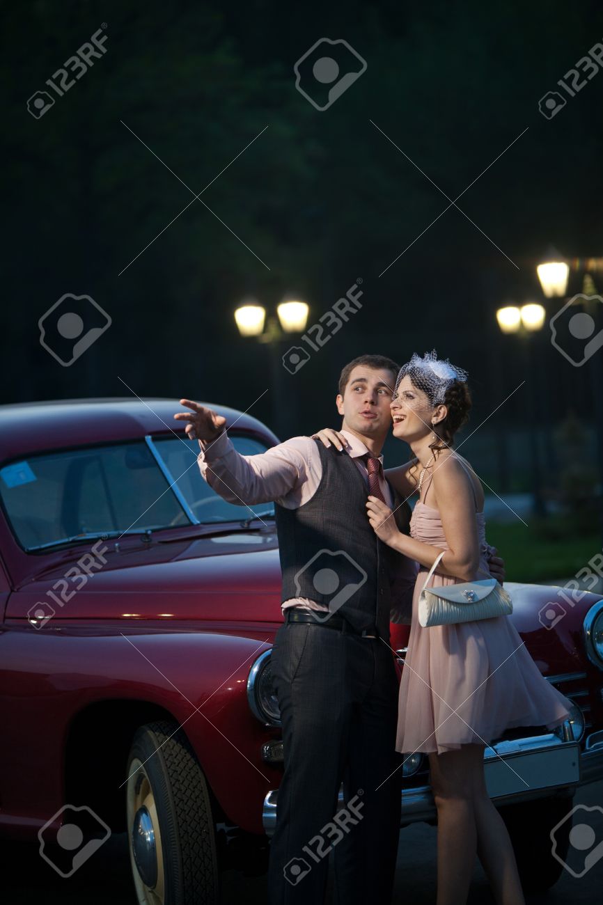 夜の街の背景にヴィンテージ車の近くにかなりのカップルの写真素材・画像素材 Image 13487106。