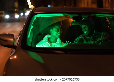 幸せな多様なカップルが車の中で、音楽やダンスを聞いて座っている。夜遅くに楽しんで踊っている車の中で日付の女性と男性のフロントガラスを通して表示します」の動画素材 ロイヤリティフリー 1087026389Shutterstock。