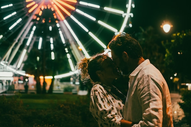 夜に照らされた観覧車に対して通りで情熱的にお互いを抱きしめる愛情のあるカップル。カップルのロマンスと夜の休暇中に屋外で充実した時間を過ごすPremium写真。
