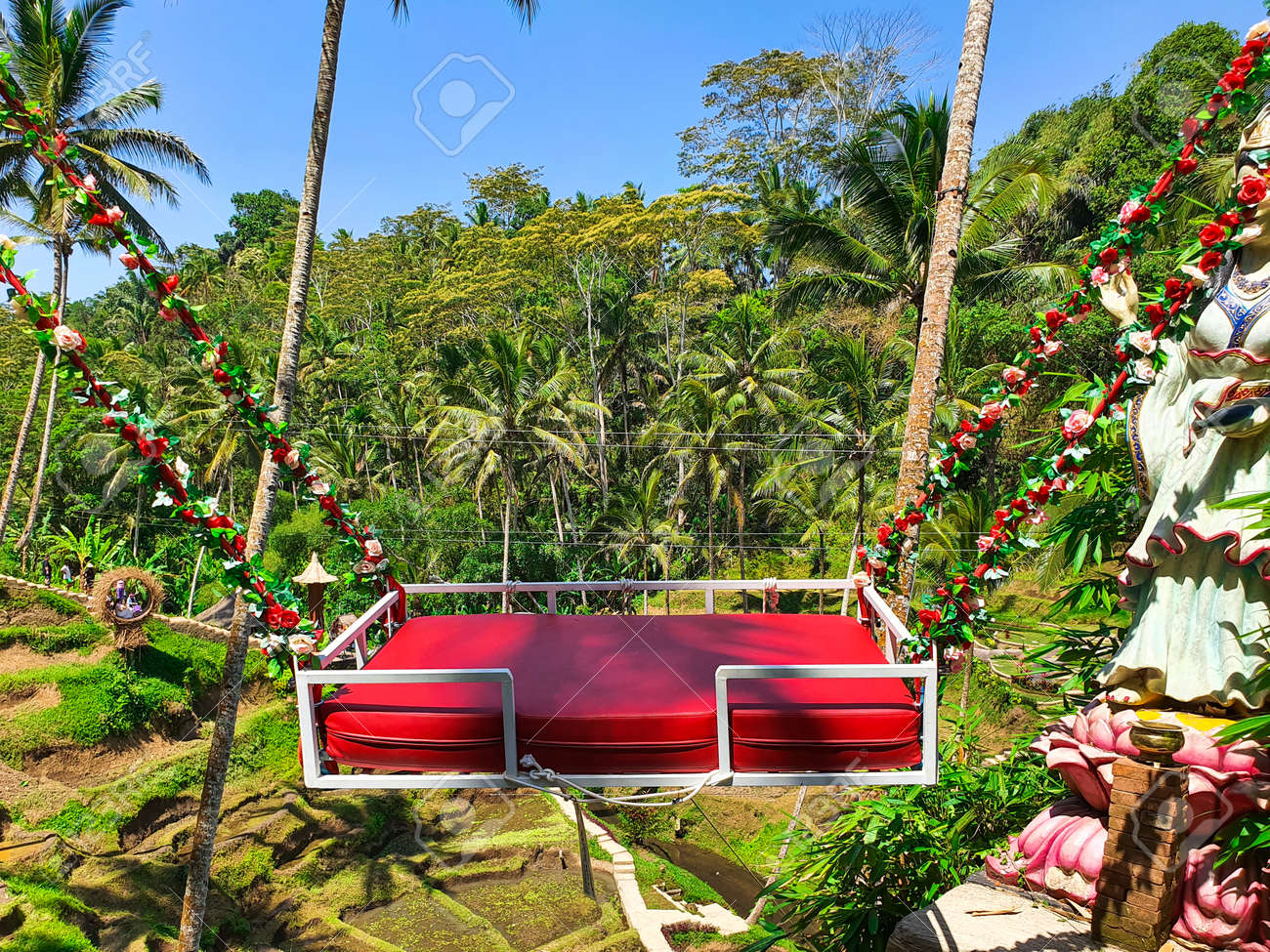 木々を背景にバリ州ウブドで楽しむための美しい赤いブランコ椅子。バリスイングの写真素材・画像素材 Image 150603417。