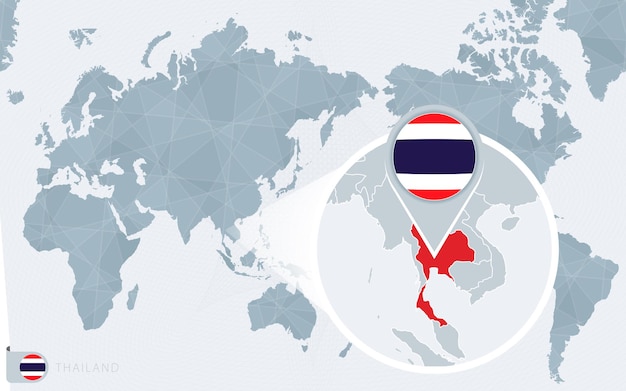 拡大されたタイの太平洋中心の世界地図。タイの旗と地図。Premiumベクトル素材。