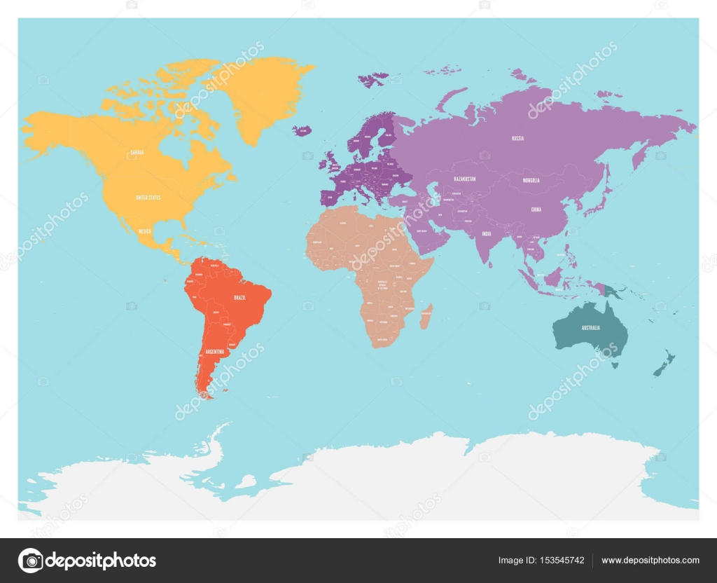 4 色の南極大陸のある世界の詳細な政治地図 ベクター, オーストラリア,。