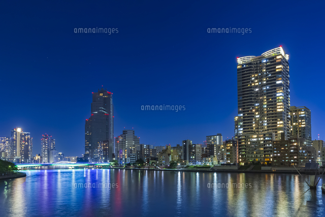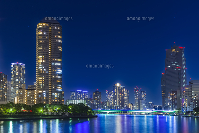 月島川水門テラスより ライトアップの佃大橋と隅田川リバーシティ高層ビル群夜景 10222031380 の写真・イラスト素材アマナイメージズ。