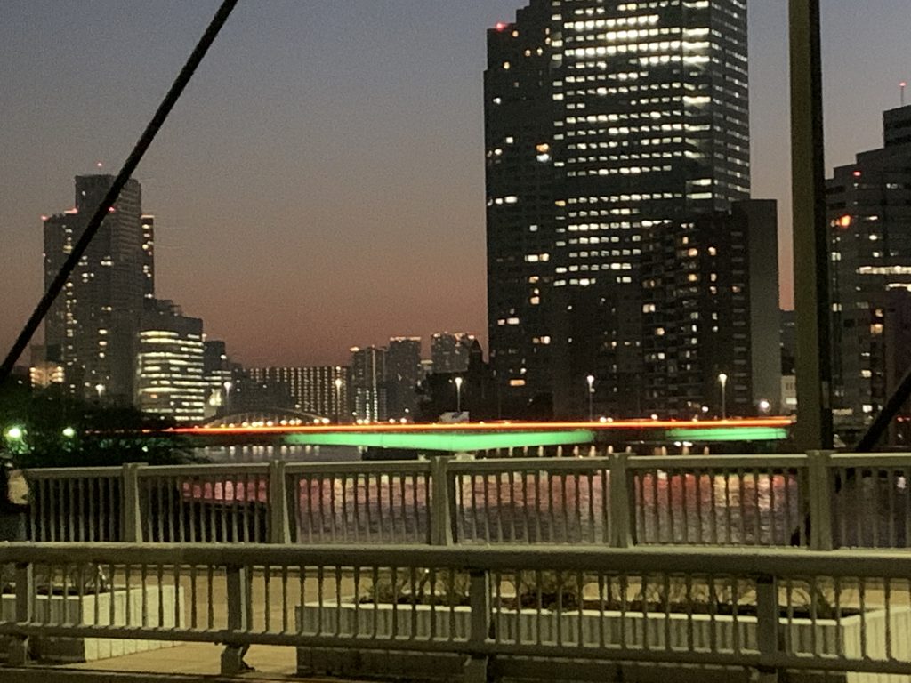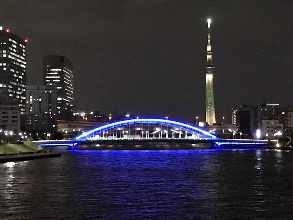 佃大橋とスカイツリーTokyo2020がんばれニッポン佃大橋スカイツリーライトアップ佃中央区東京chuocitytokyojapan。