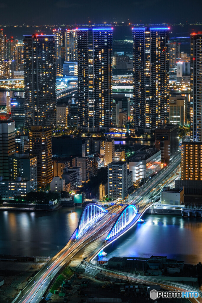 Foto 東京中央区夜景 佃大橋ライトアップと月島方面の夜景 do。