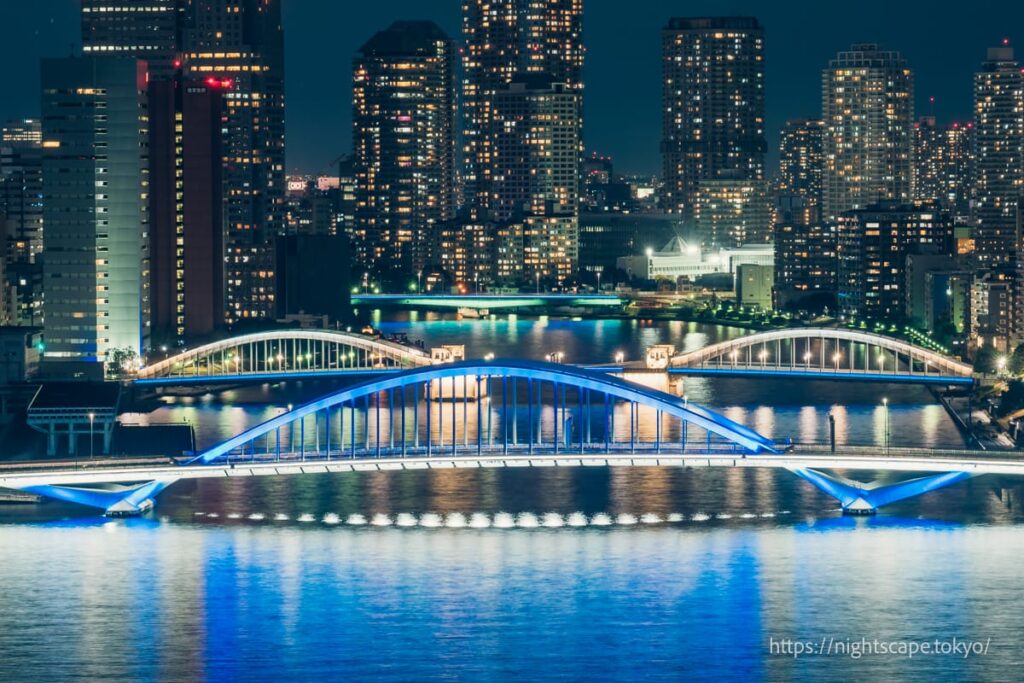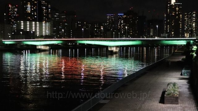 隅田川に架かる橋のライトアップ築地大橋~佃大橋。