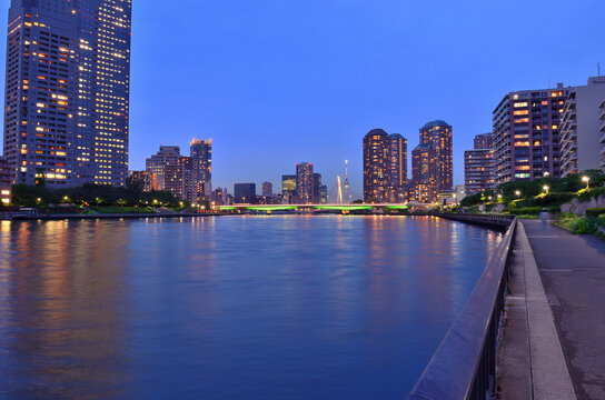 月島から見るライトアップされた佃大橋と中央大橋とスカイツリーの写真素材89937595- PIXTA。