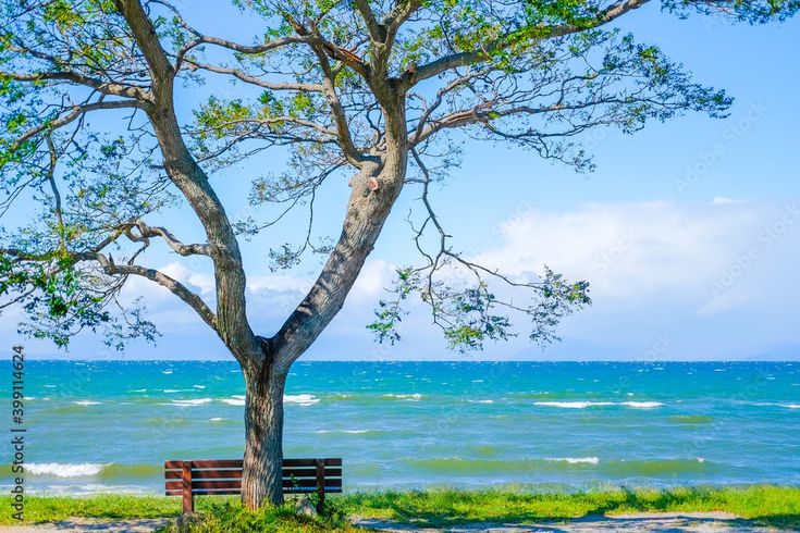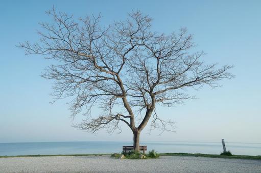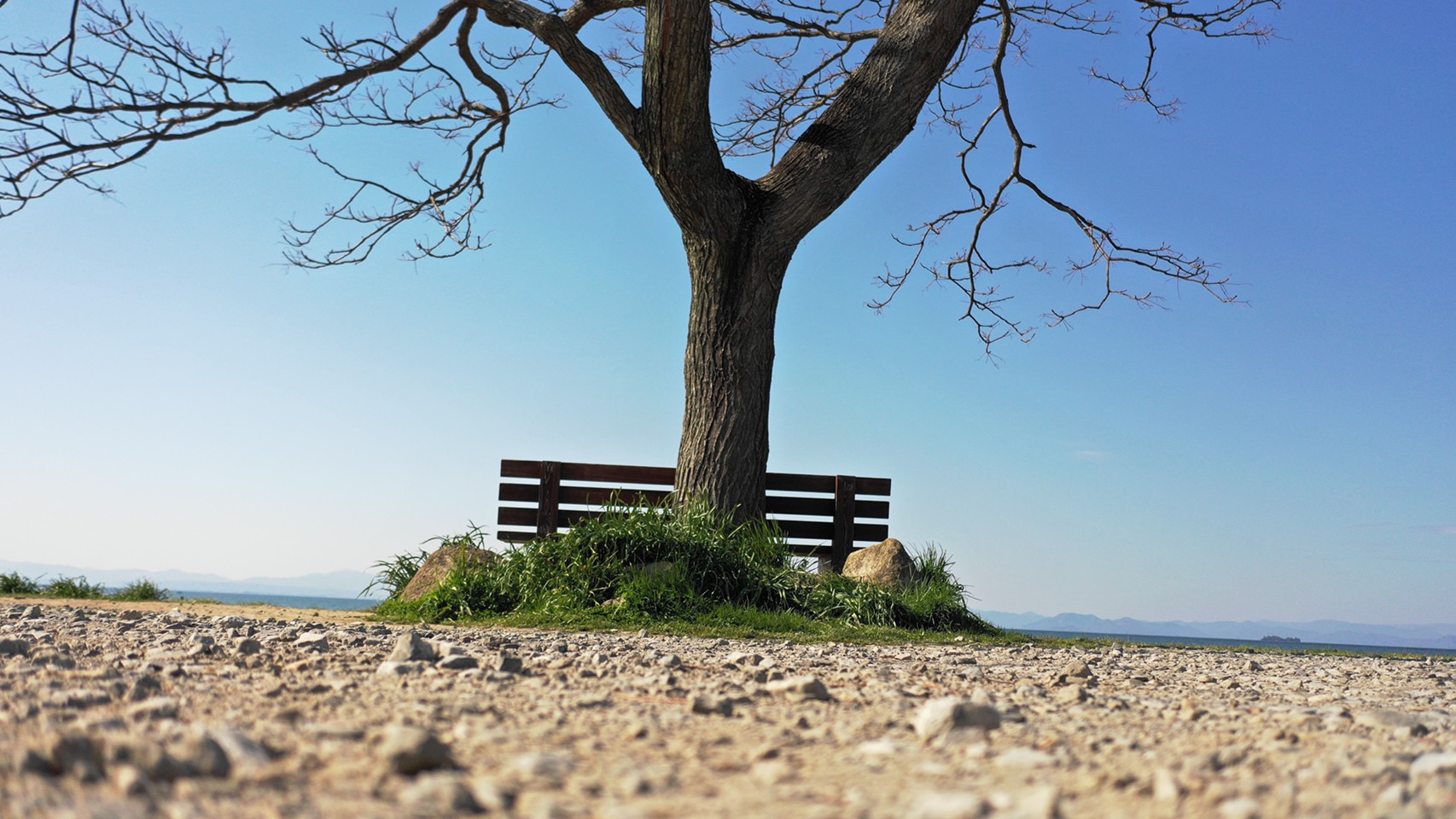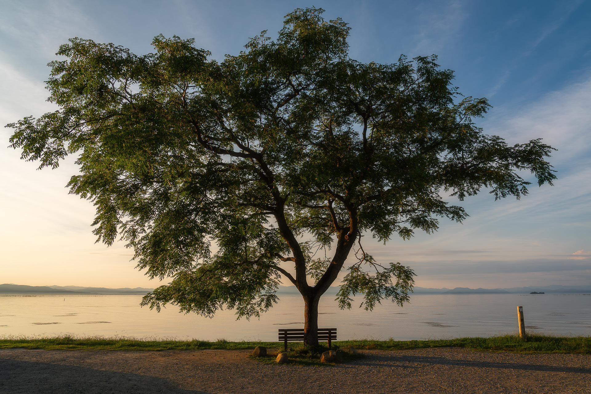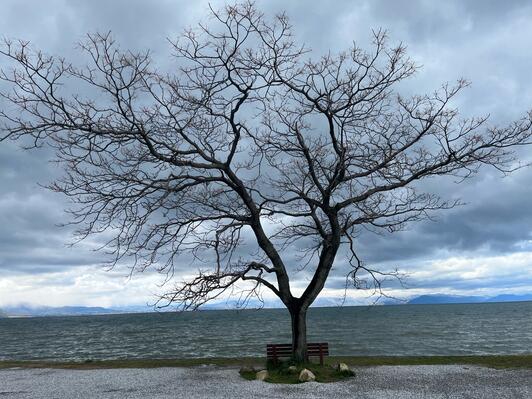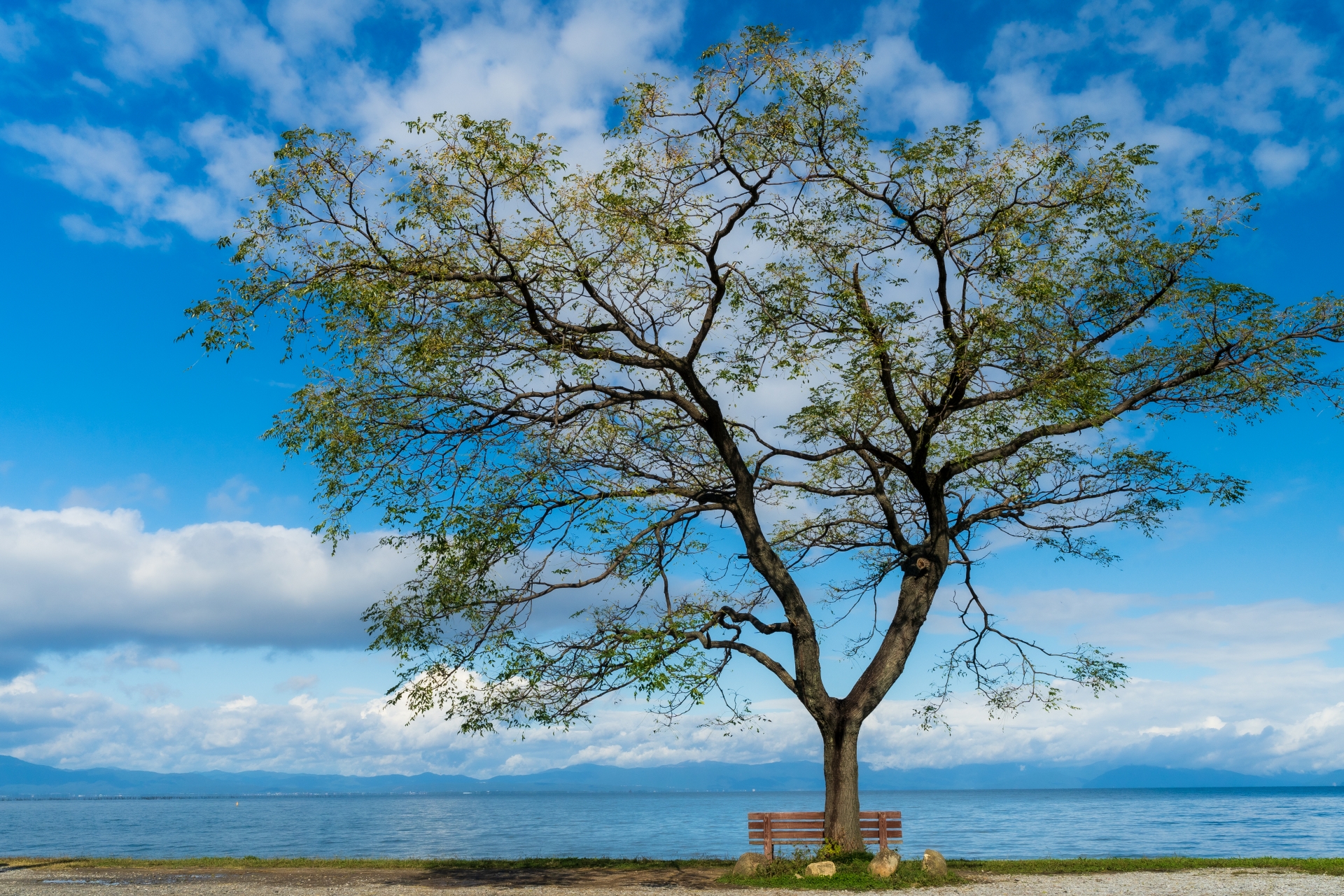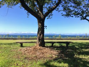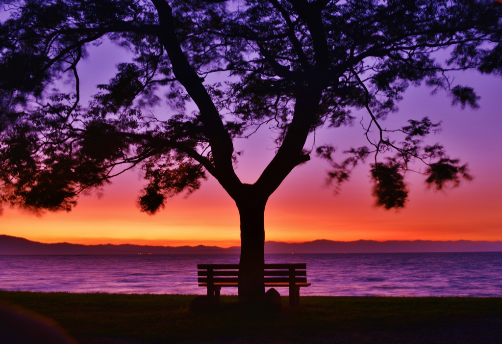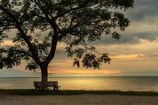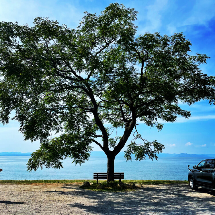 滋賀県彦根市、びわ湖を眺める特等席『あのベンチ』 地元 石寺町 の方が湖畔の「センダンの木」の下にベンチを設置したのがはじまり。2018年ころSNSで話題となって、昨年にはNHKの『ドキュメント72』でも放送されました。。
