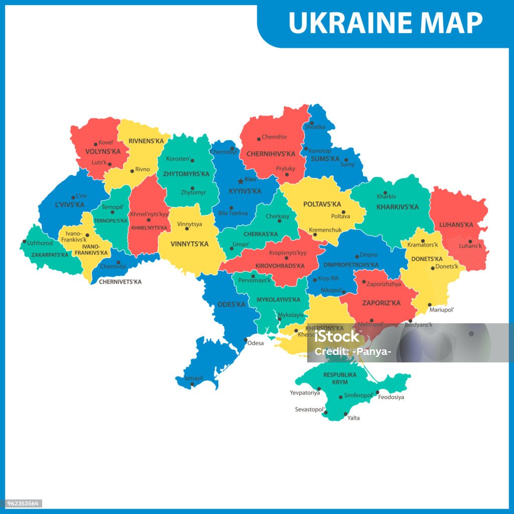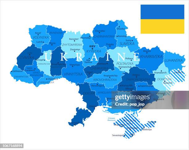 地域または州と都市首都が付いているウクライナの地図行政区画クリミア自治共和国ドネツクとルガンスクの地域の一部は係争中の領土としてマークされています -アイコンのベクターアート素材や画像を多数ご用意 -。