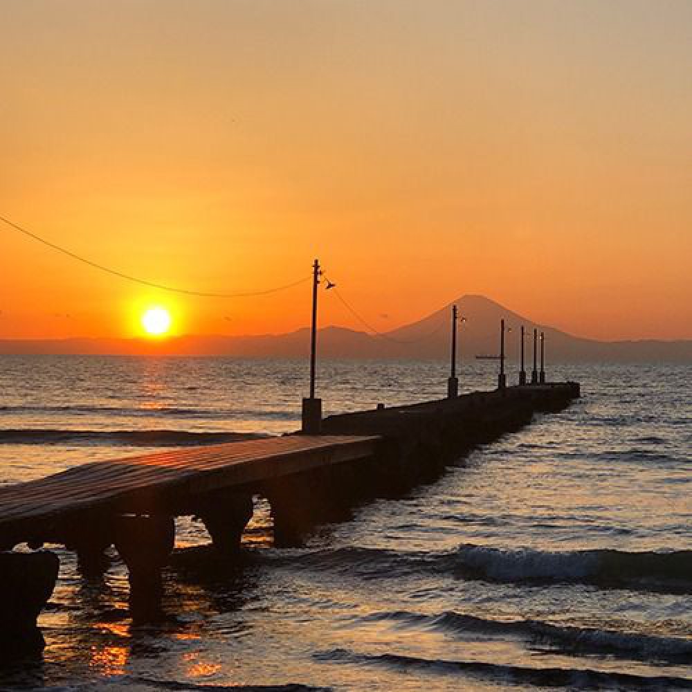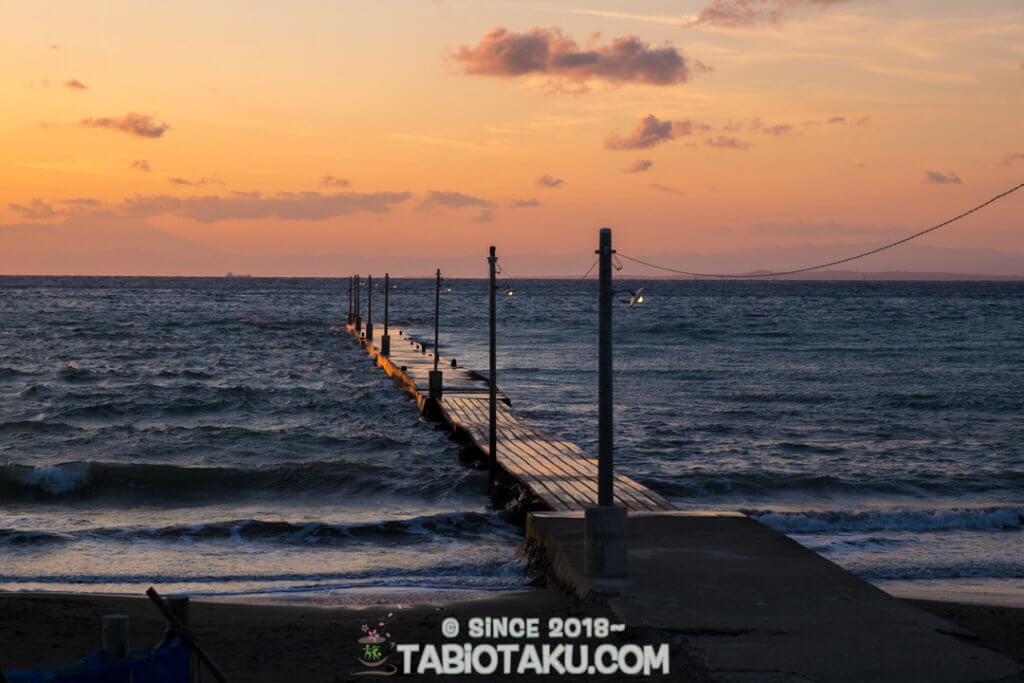 原岡海岸〜東京湾の海から富士山へと続く雰囲気ある桟橋の夕景!裸電球が素敵な房総半島の海岸。