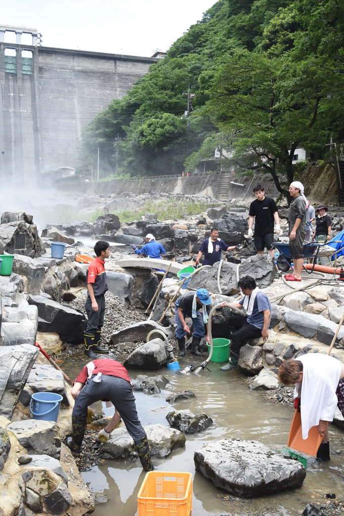 湯原温泉砂湯清掃│津山朝日新聞社。