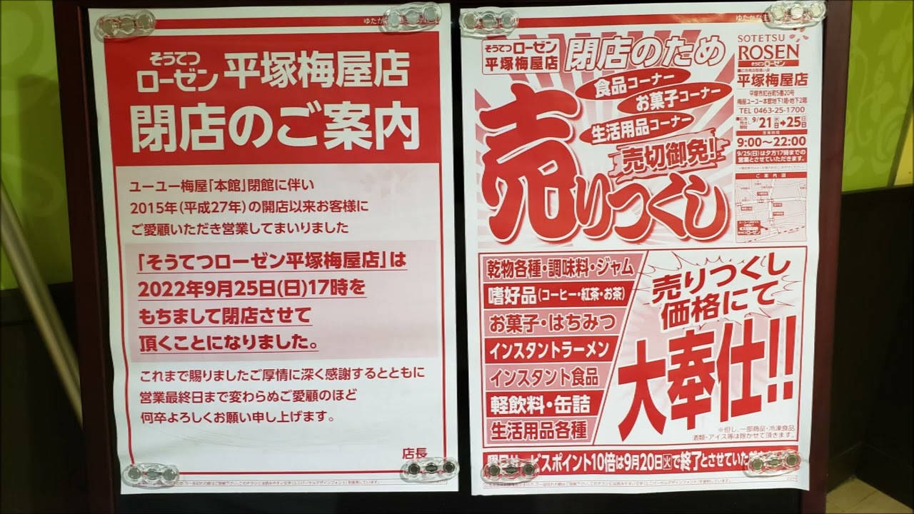 平塚市 「そうてつローゼン平塚梅屋店」が9月25日 日 に閉店します。