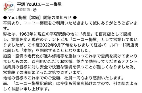 平塚市 ユーユー梅屋「本館」が2022年9月下旬に閉店します。号外NET 平塚市・大磯町。