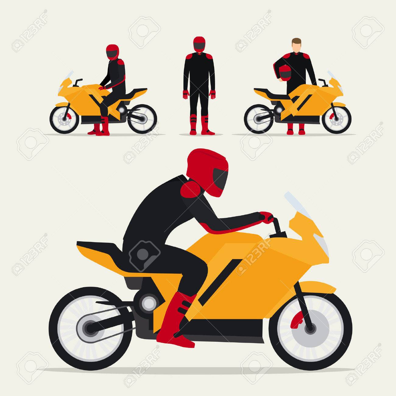 別のバイクとバイクに乗る人はポーズ フラット ベクトル図です。バイク オートバイのイラスト素材・ベクター Image。