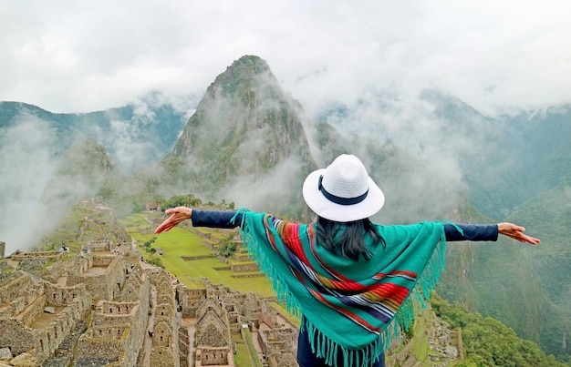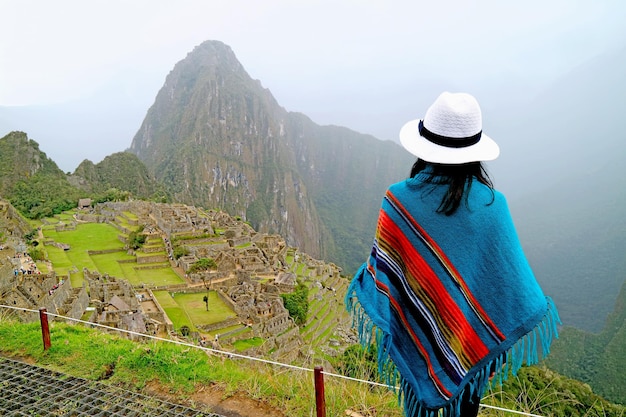 ペルーのクスコ地方にあるマチュピチュの古代インカの城塞に感銘を受けた青いポンチョの女性Premium写真。
