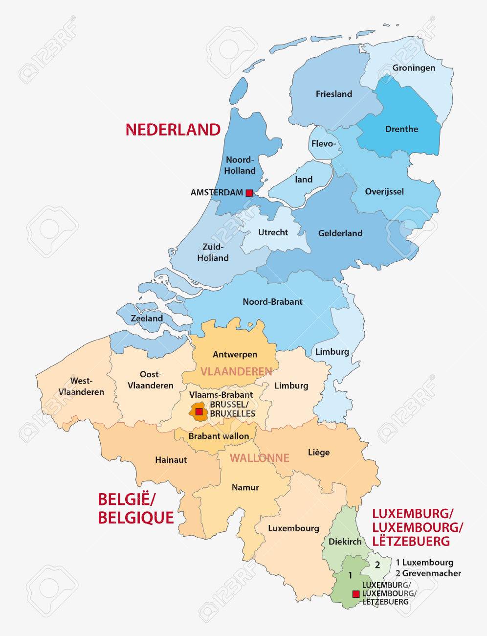 3 ベネルクス 3 国オランダ、ベルギー、ルクセンブルクの行政地図のイラスト素材・ベクター Image。