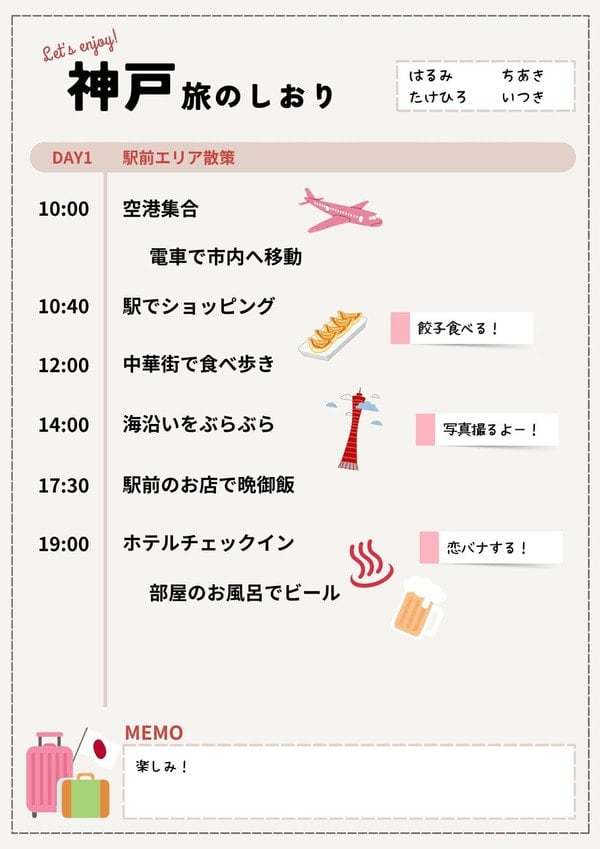 かわいく旅行日程表テンプレート・無料Canva。