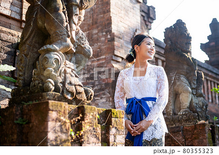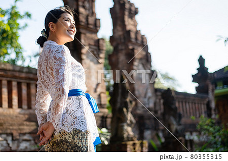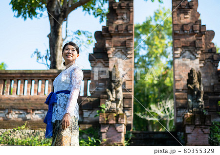 バリ島の伝統寺院にいる伝統衣装 クバヤ を着た女性の写真素材80355322- PIXTA。