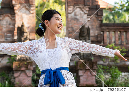 バリ島の伝統寺院にいる伝統衣装 クバヤ を着た女性の写真素材79266107-。